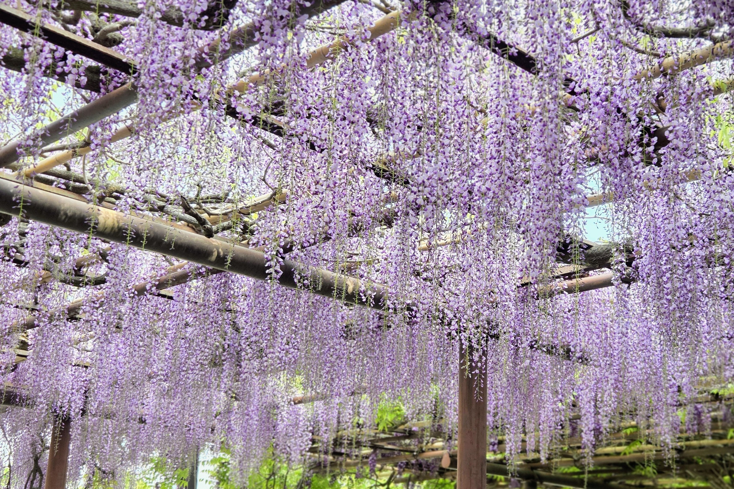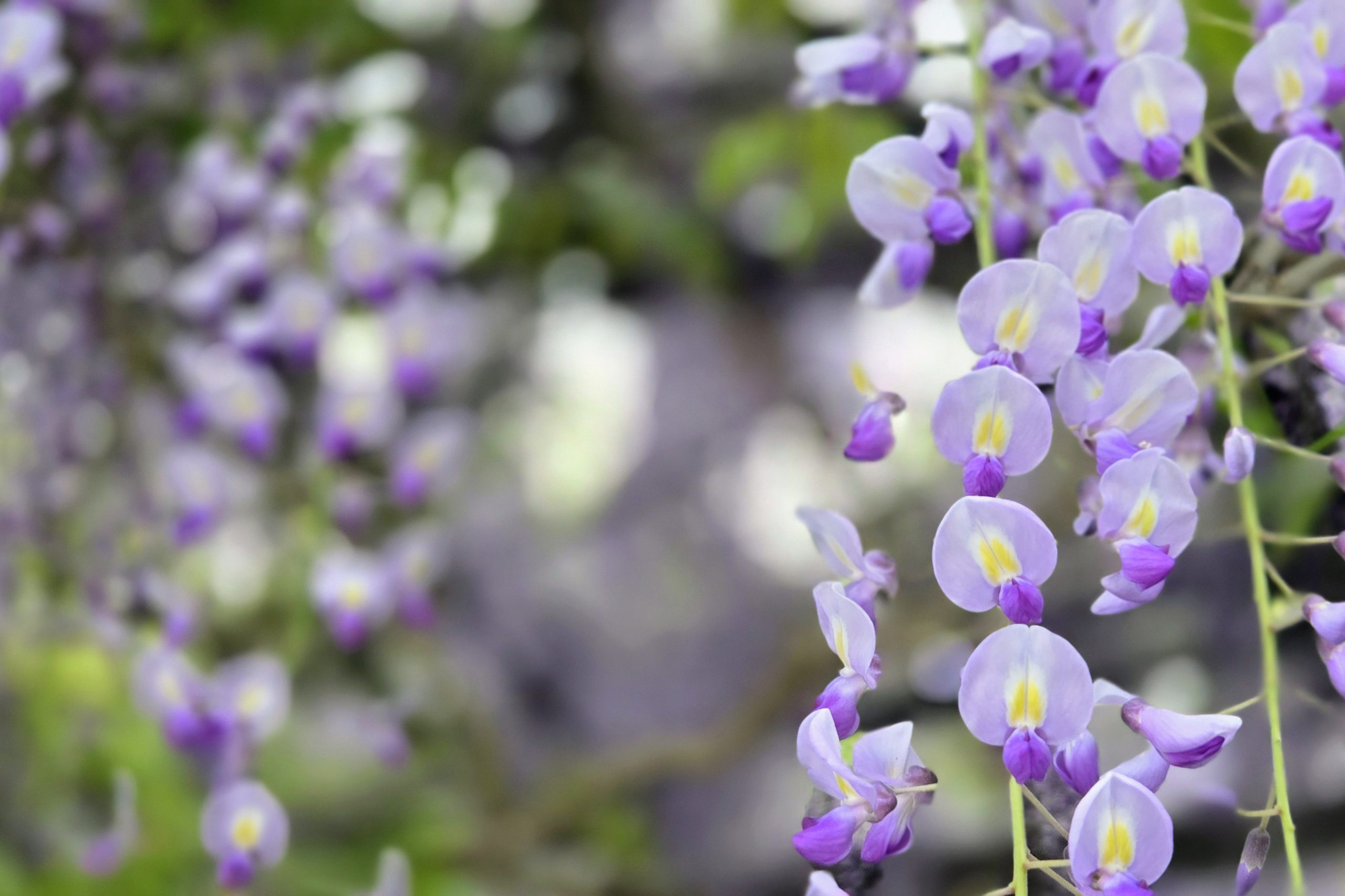 ブドウの房のように花びらが幾重にも重なる、珍しい「八重の藤」の華やかな姿は必見です。