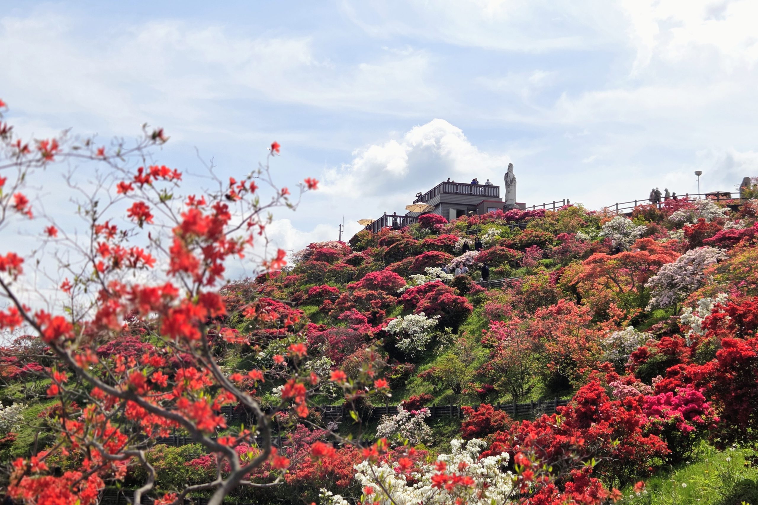 笠間つつじ公園では、山一面に約8,500株のつつじが咲き誇り、見渡す限りの赤やピンクに染まる絶景が広がっています。